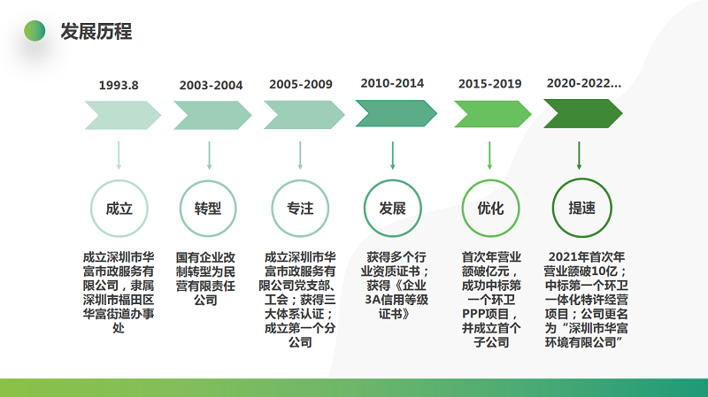 - 2003年成立企业党支部;2004年成立企业工会。 - 通过《质量管理体系》、《环境管理体系》、《职业健康安全管理体系》认证;深圳市清洁服务行业甲级资质企业; - 获得《城市生活垃圾经营性清扫、 收集、运输服务许可证》。 - 2007年1月,中标广东省外第一个环卫市场化项目(环卫保洁项目),并成立首个分公司。 |