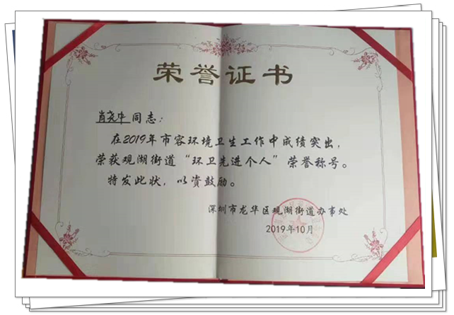 在此次表彰大会上,我司员工肖尧中同志荣获观湖街道“环卫先进个人”奖。