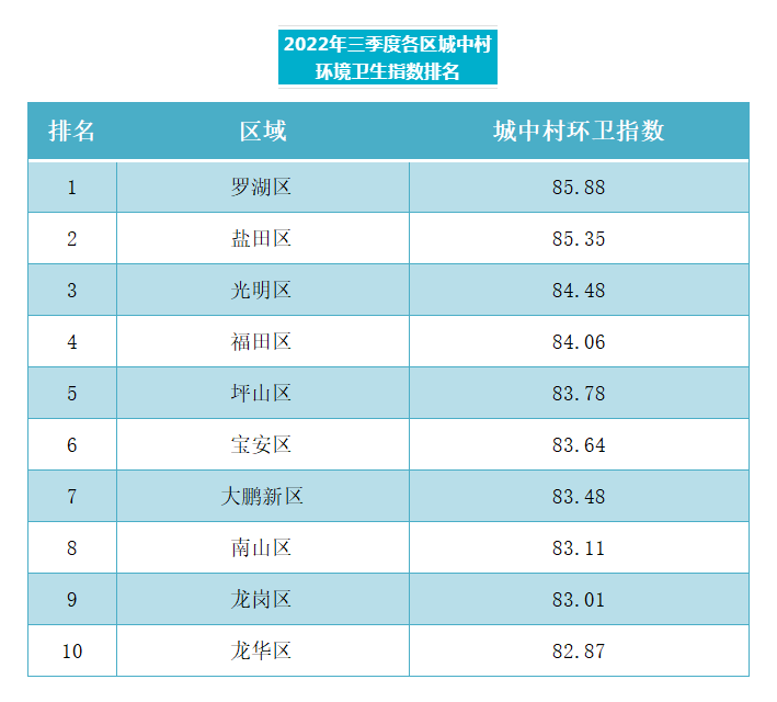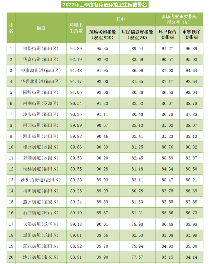10月10日,市城管和综合执法局发布2022年三季度深圳市环境卫生指数测评结果。三季度,全市环境卫生指数为87.89,其中现场考察指数为88.59,居民满意度指数为79.75。