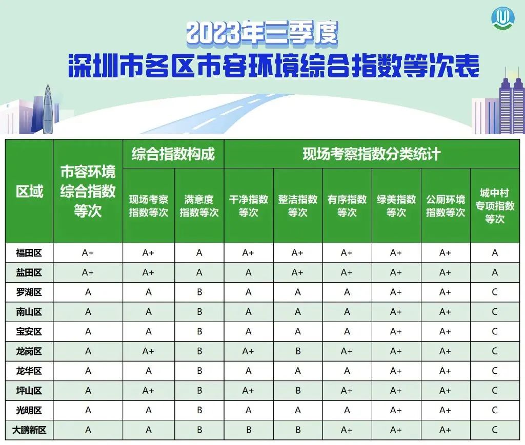 全市10个区(新区)中,福田、盐田区市容环境综合指数达到A+等次,其他8个区(新区)均为A等次。